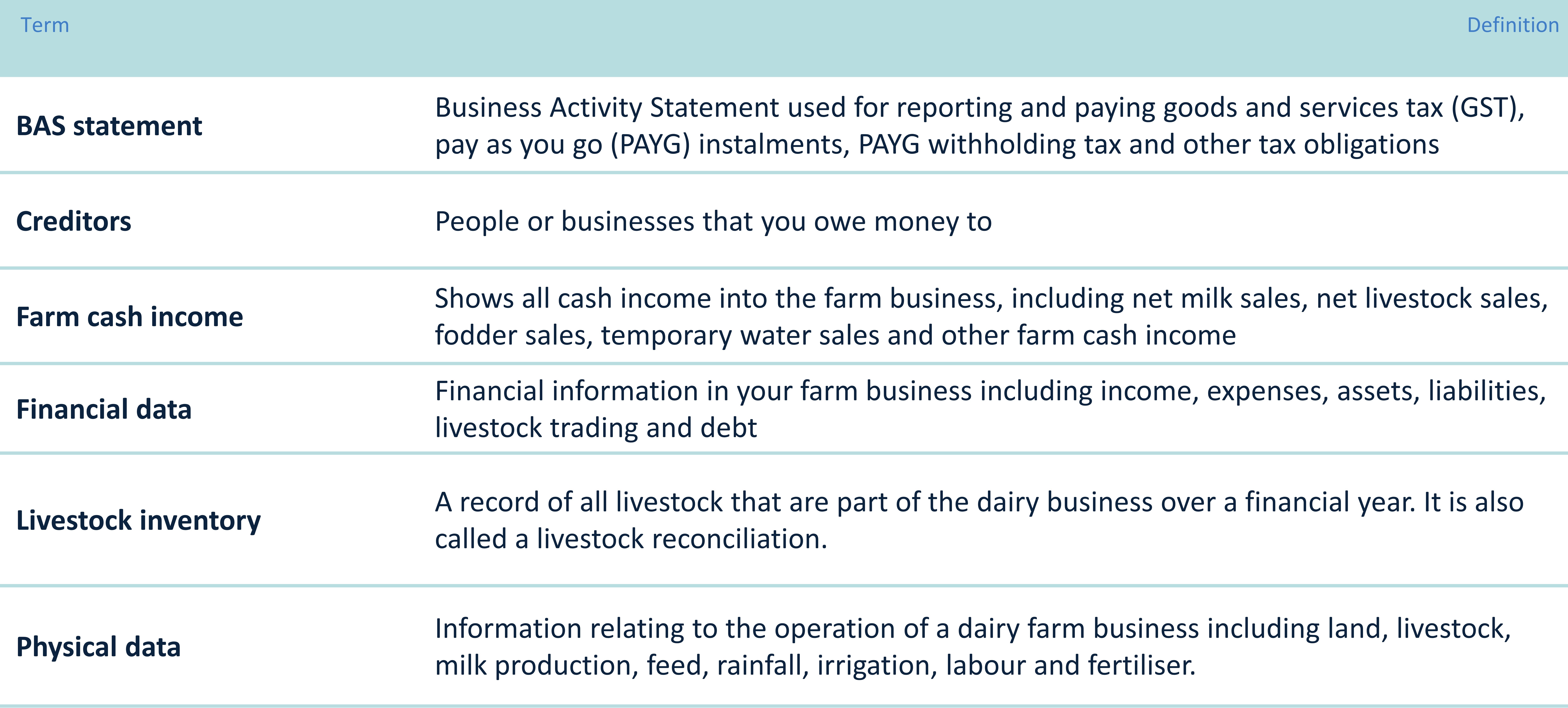 ‘Farm Business Fundamentals’ aims to provide participants with the skills and knowledge to implement farm financial practices and processes in a farm business. By adopting concepts such as Dairy Australia’s Standard Chart of Accounts and recording key physical and financial information participants will be able to prepare and organise information about their farm business, including an annual cash budget and a balance sheet.