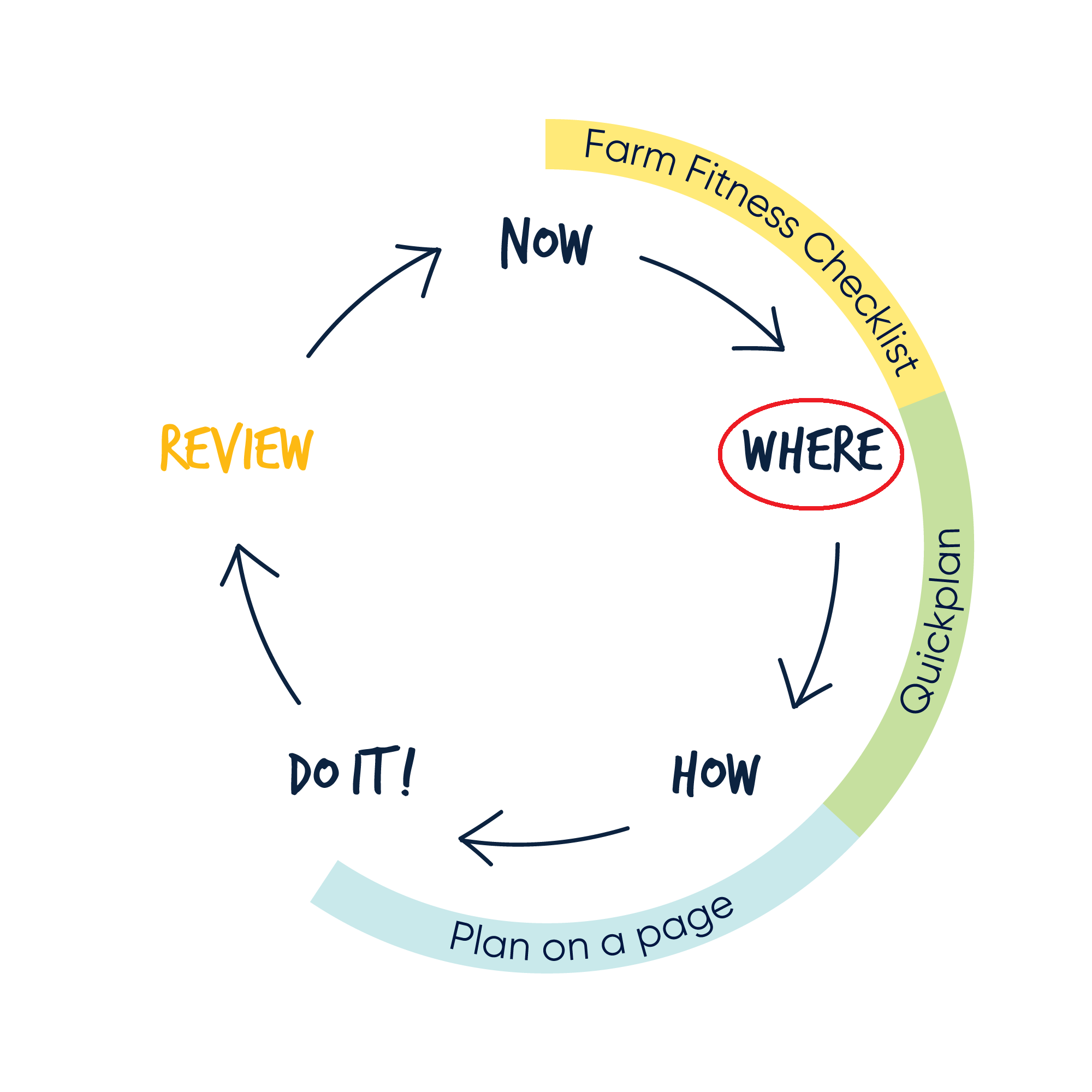 The 'Now-Where-How-Review' Business Planning Cycle - find more detail on page 2 of the QuickPlan workbook.
